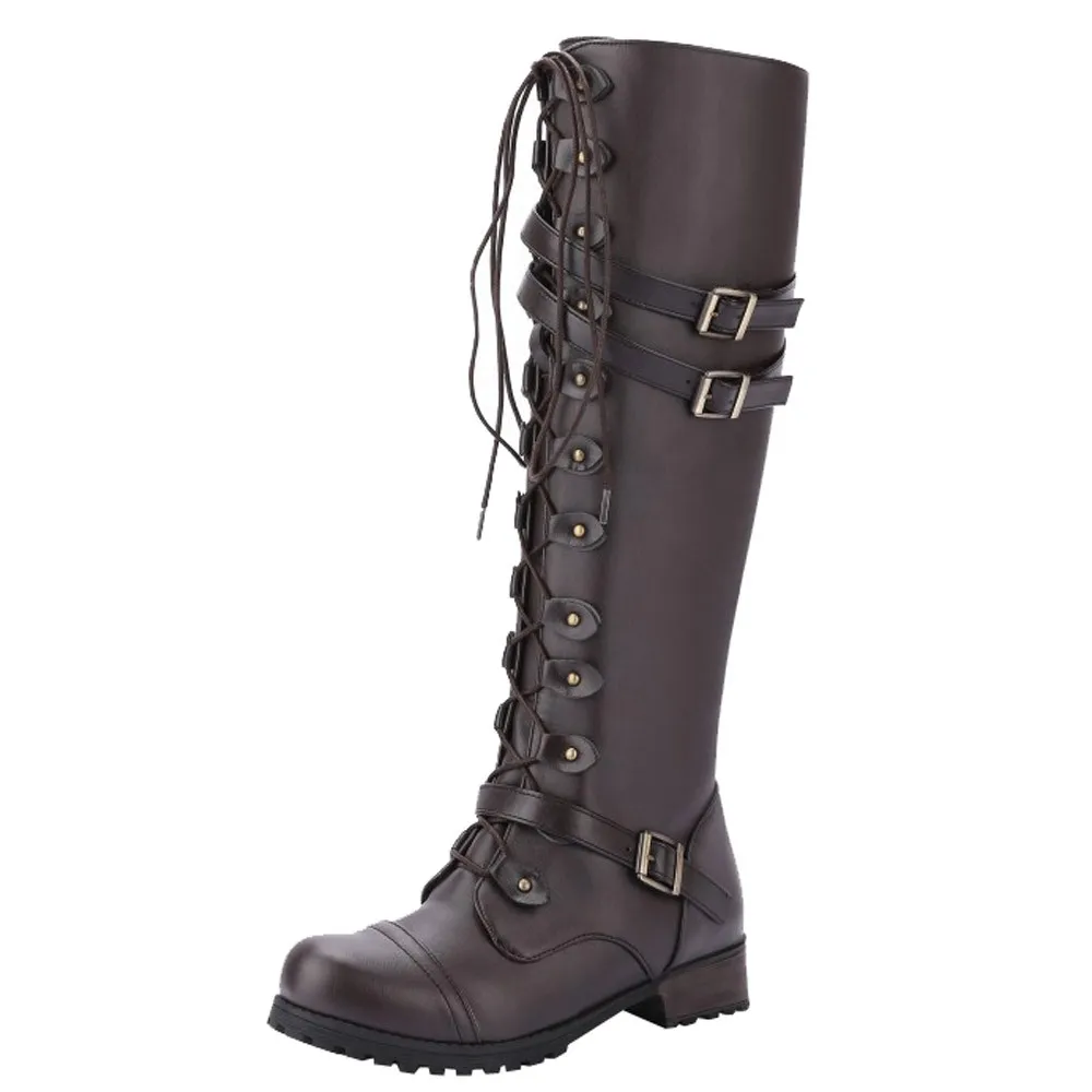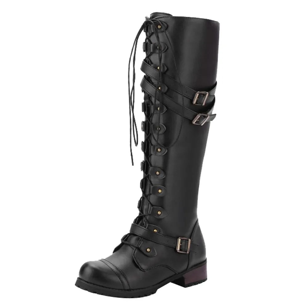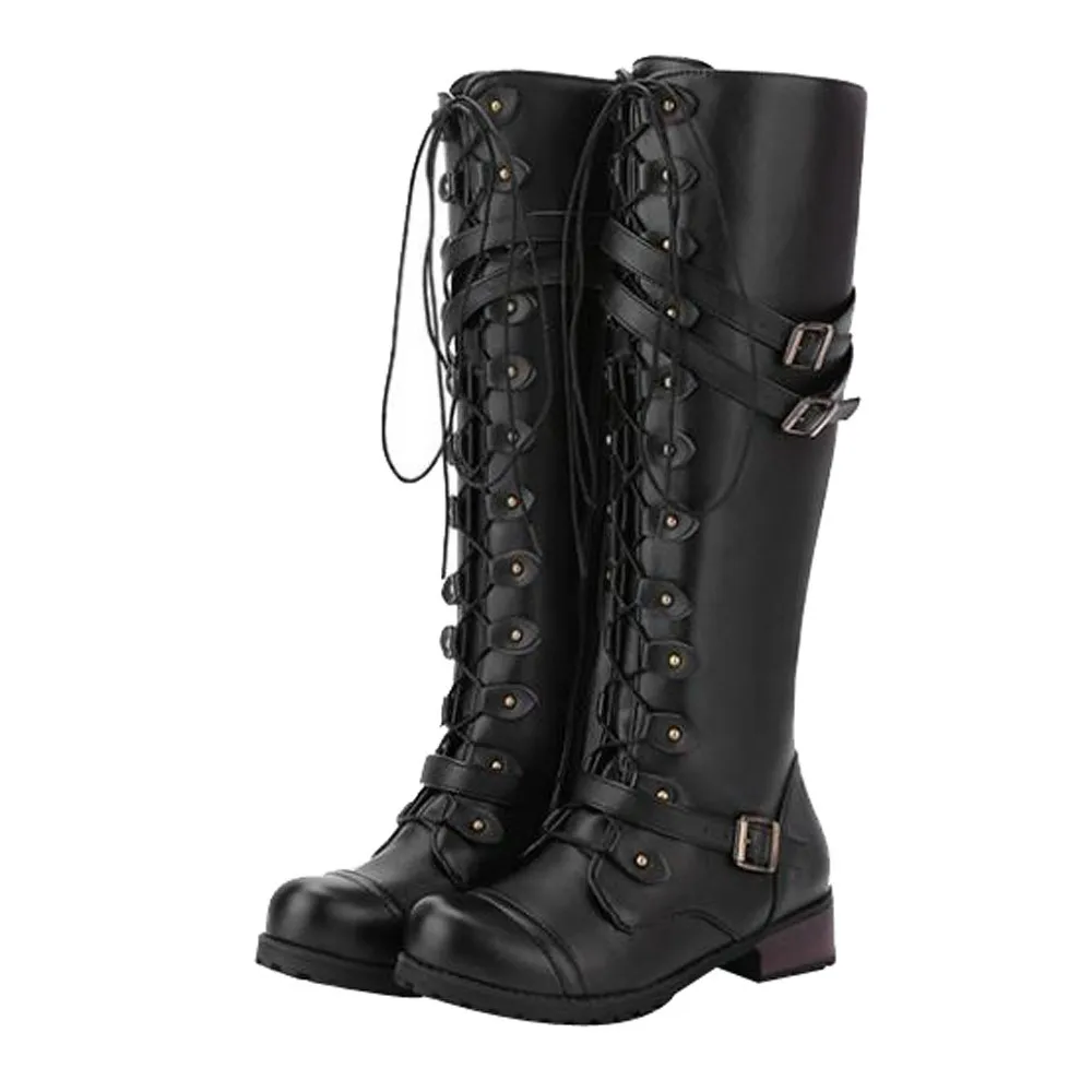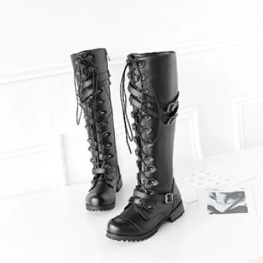 Boots Women Knee-Hight Boots Winter Warm Steampunk Gothic Vintage Retro Punk Buckle Military Combat Lace up Boots botas mujer