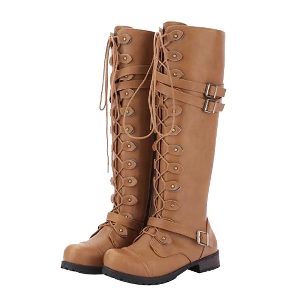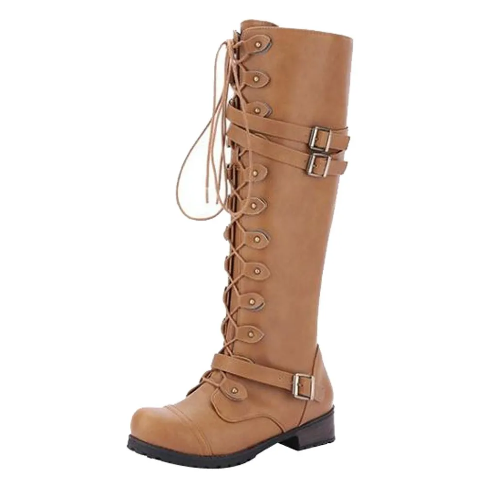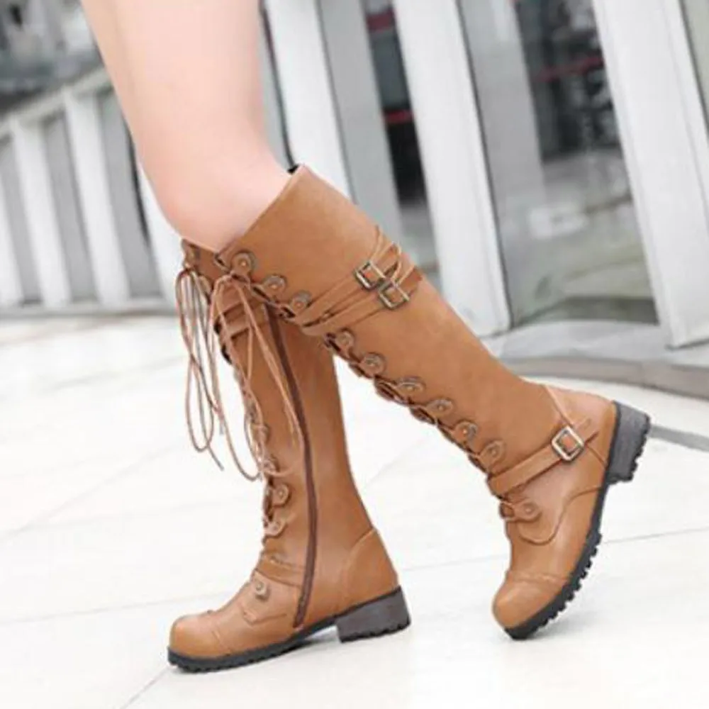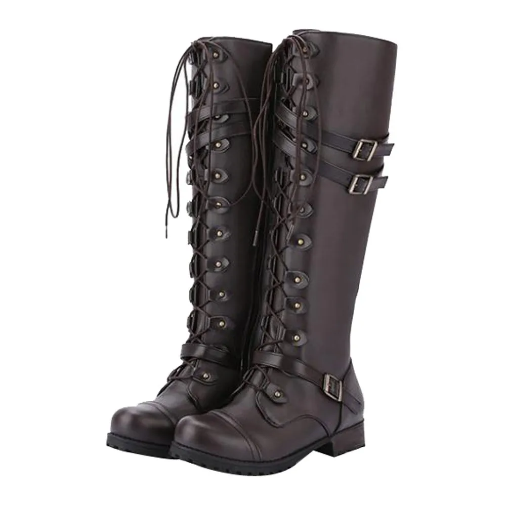 Boots Women Knee-Hight Boots Winter Warm Steampunk Gothic Vintage Retro Punk Buckle Military Combat Lace up Boots botas mujer