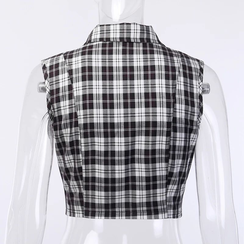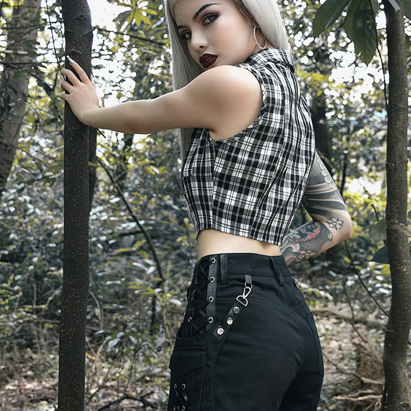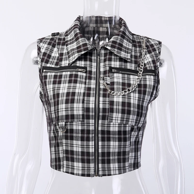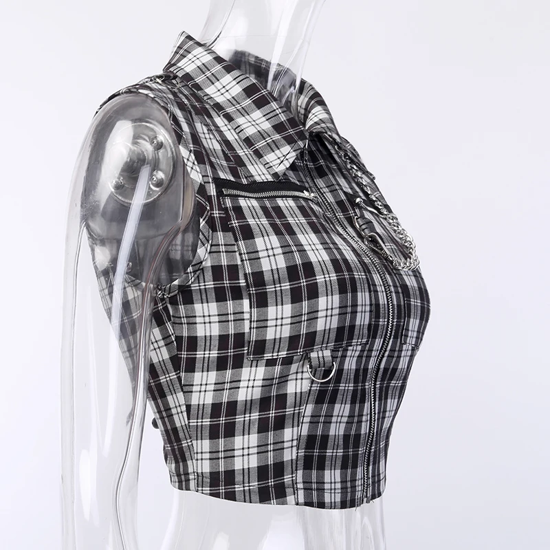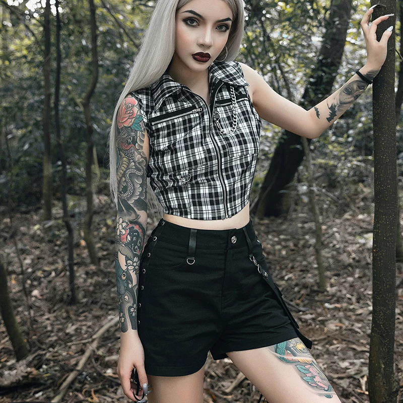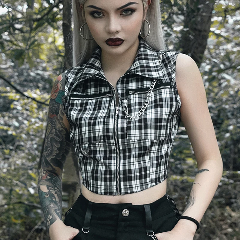 Gothic Chic Sexy Crop Tops Women T-shirt White Black Plaid Punk Streetwear Zipper Chain Plaid Female Goth Retro Hi Hop Camis Top