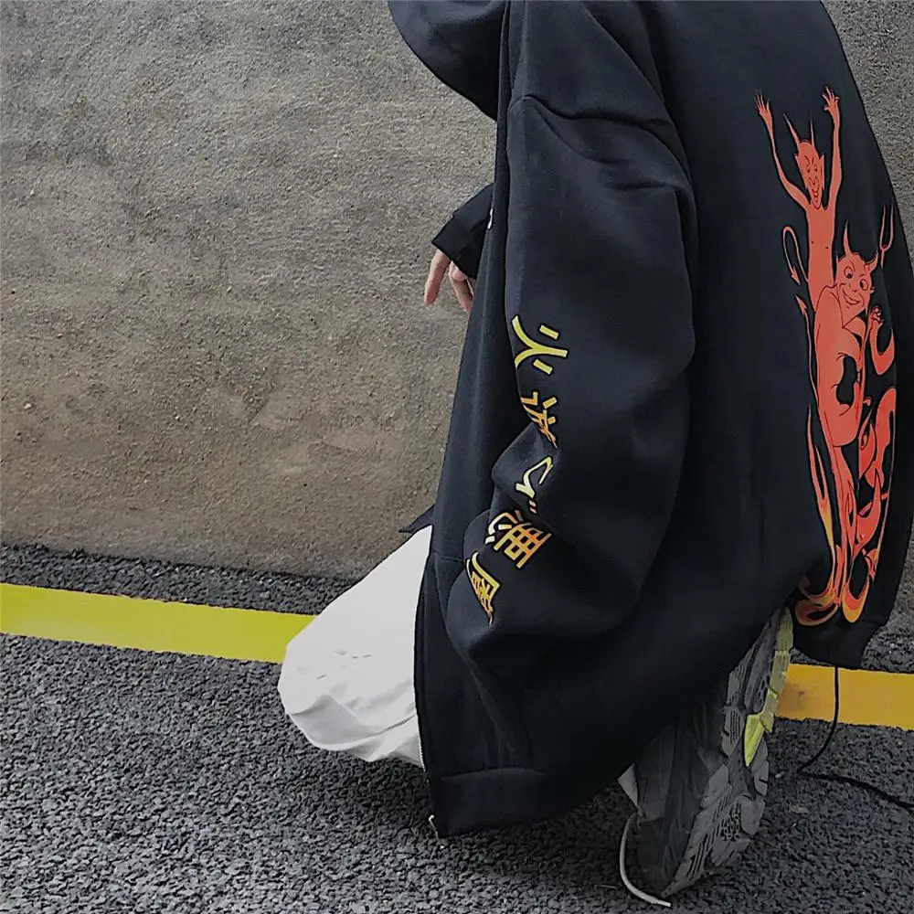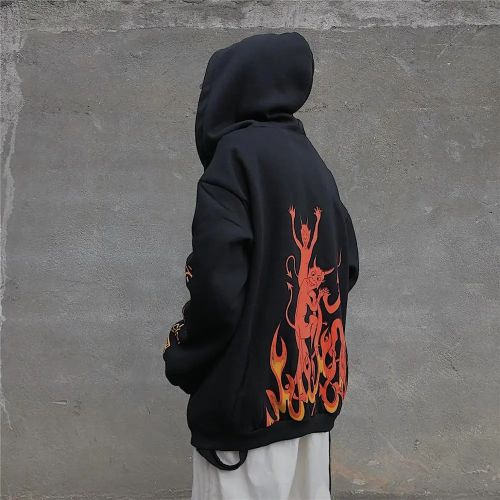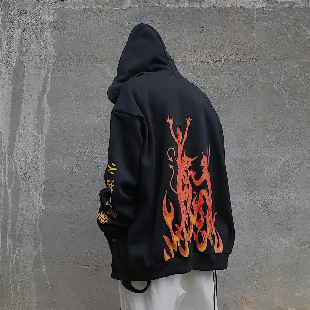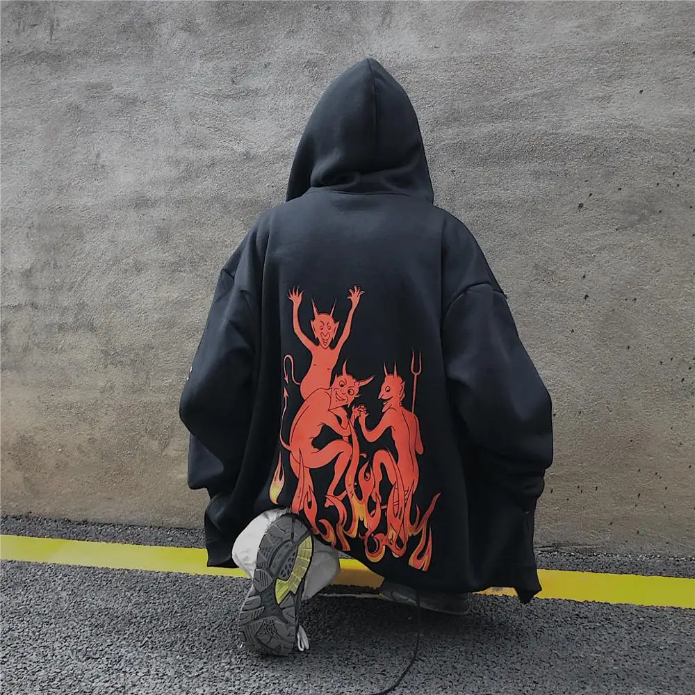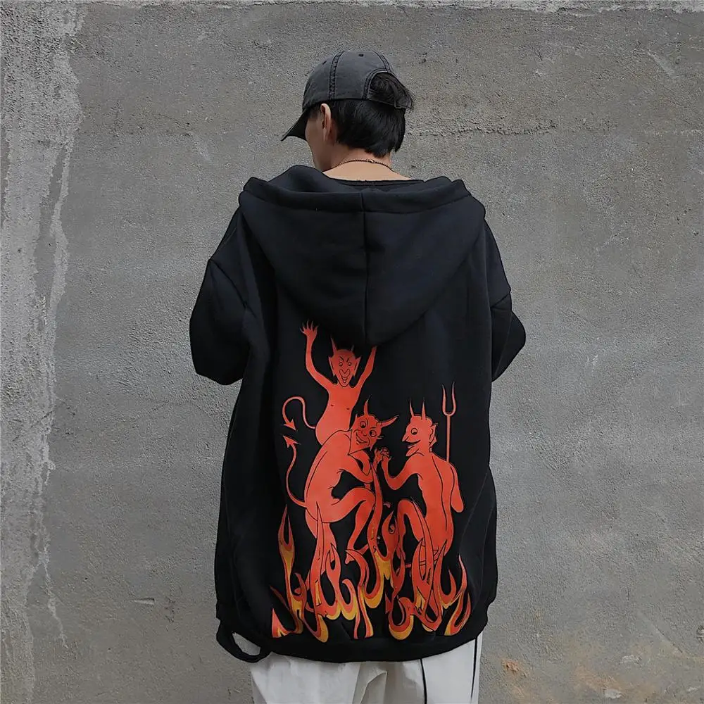 Cool Gothic Unisex Zip-up Hooded Sweatshirt 2020 Woman Man Flocking Funny Fire Demon Print Letter Harajuku Hoodies Hip-pop Black