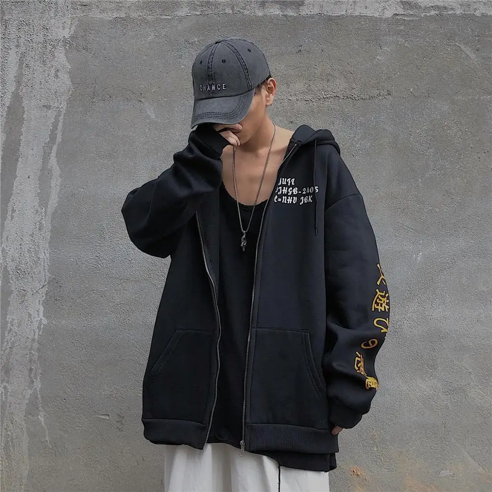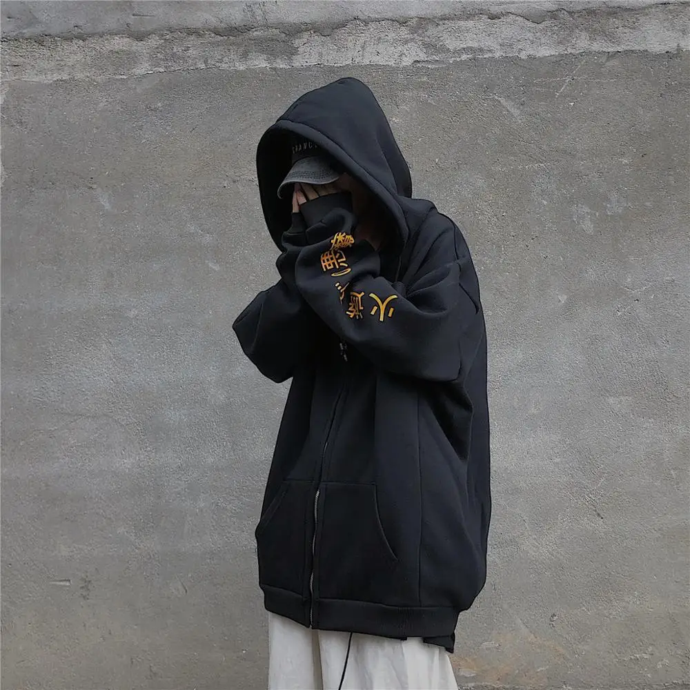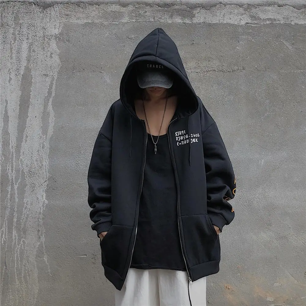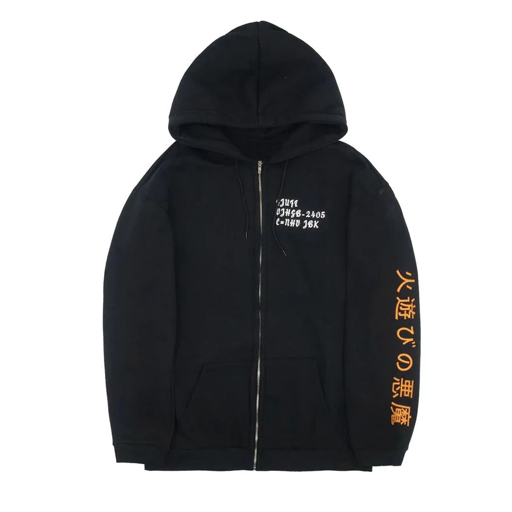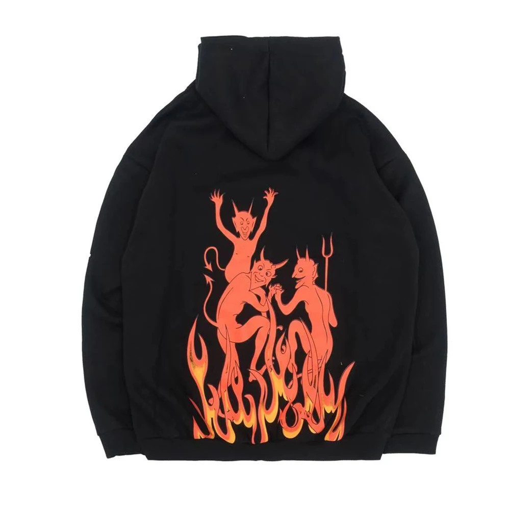 Cool Gothic Unisex Zip-up Hooded Sweatshirt 2020 Woman Man Flocking Funny Fire Demon Print Letter Harajuku Hoodies Hip-pop Black