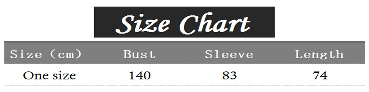 One Size : Bust 140 cm ; Sleeve 83 cm ; Length 74 cm .