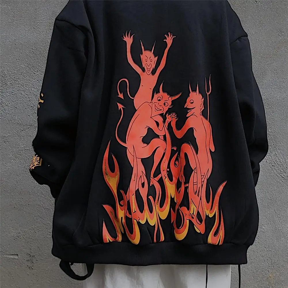 Cool Gothic Unisex Zip-up Hooded Sweatshirt 2020 Woman Man Flocking Funny Fire Demon Print Letter Harajuku Hoodies Hip-pop Black (black One Size)