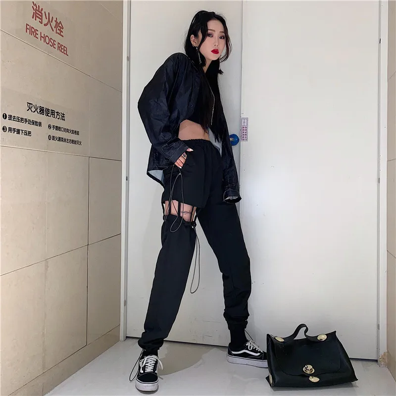 Punk Black Asymmetry Cool Women Cargo Pants Lady Shrinkable Shir One Side Hollow Out Rock Outdoor Sport Ankle-Length Trousers (black One Size)