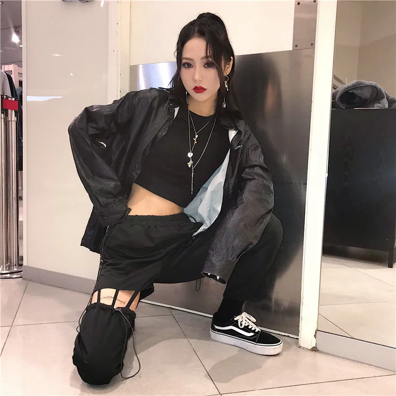 Punk Pure Black Asymmetry Cool Women Pants Lady Shrinkable Shir One Side Hollow Out Rock Outdoor Sport Ankle-Length New Trousers
