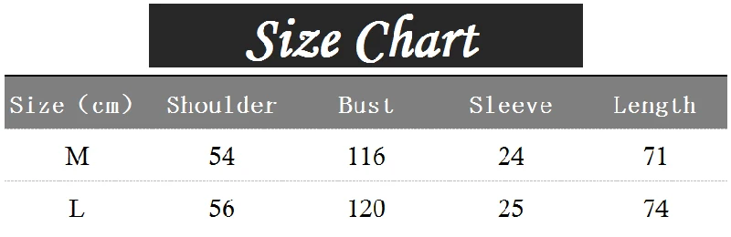 Size L : Shoulder 56 cm ; Bust 120 cm ; Sleeve 25 cm ; Length 74 cm .