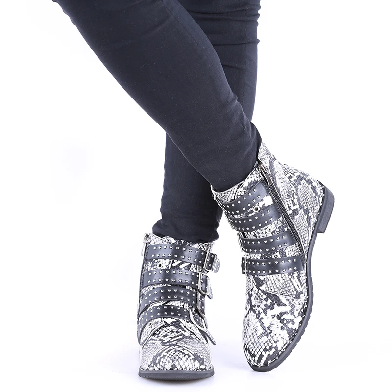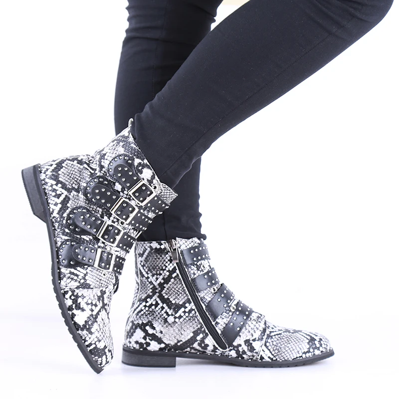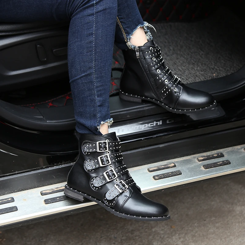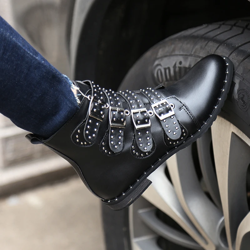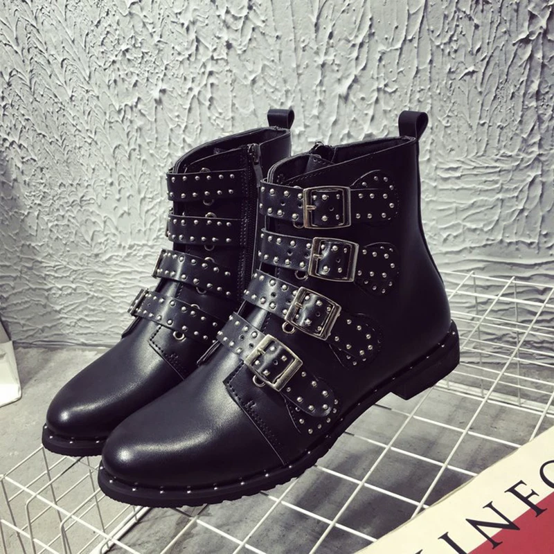 2019 Women's Boots Studded Boots Women PU Leather Rivets Booties Buckle Straps Black Boots Ankle Winter Boot Women