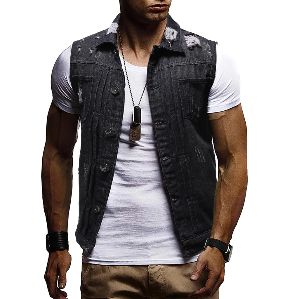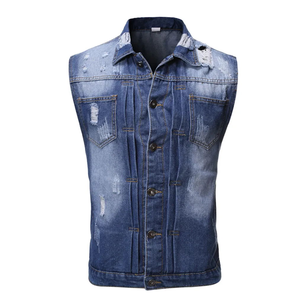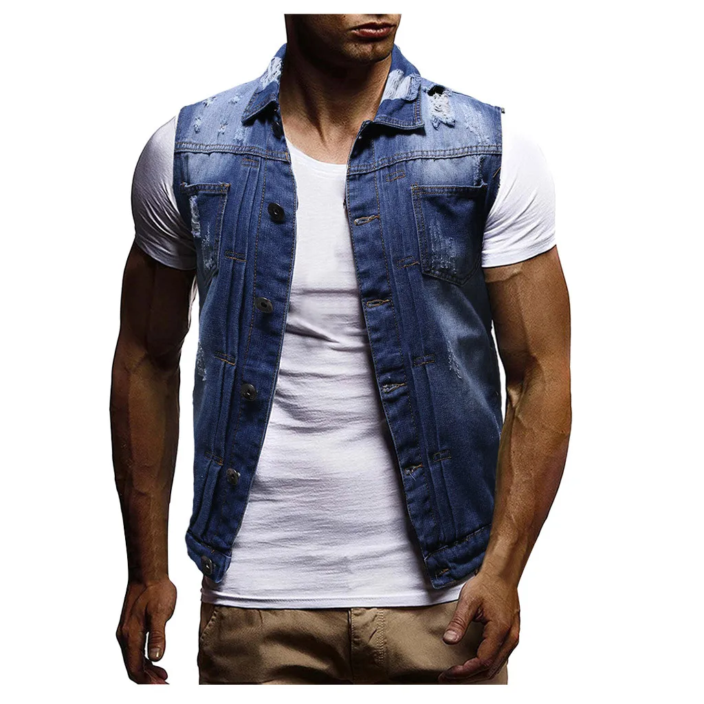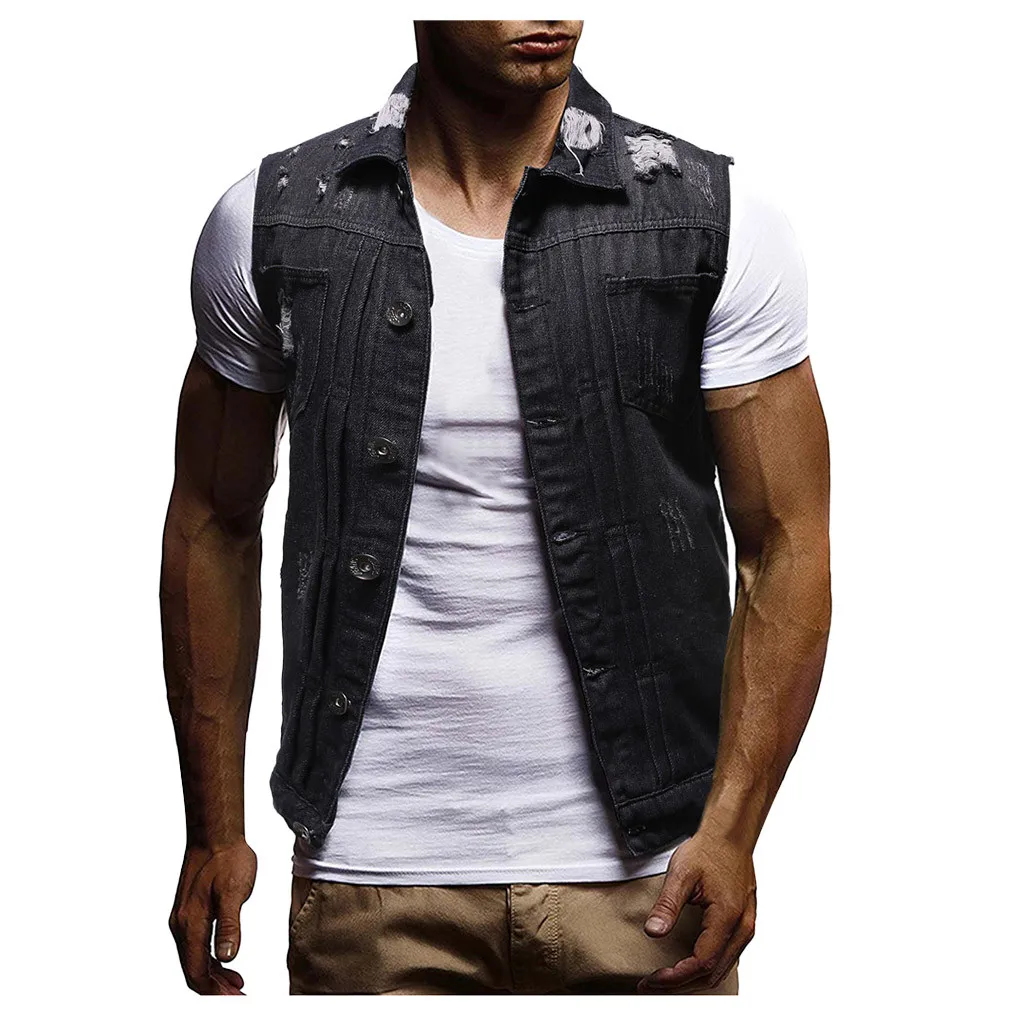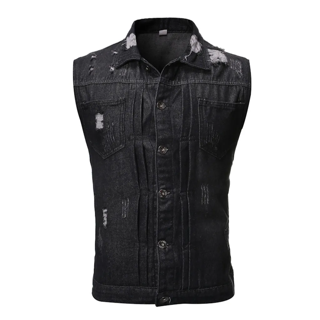 Men's Autumn Winter Destroyed Vintage Denim Jacket Waistcoat Blouse Vest Top