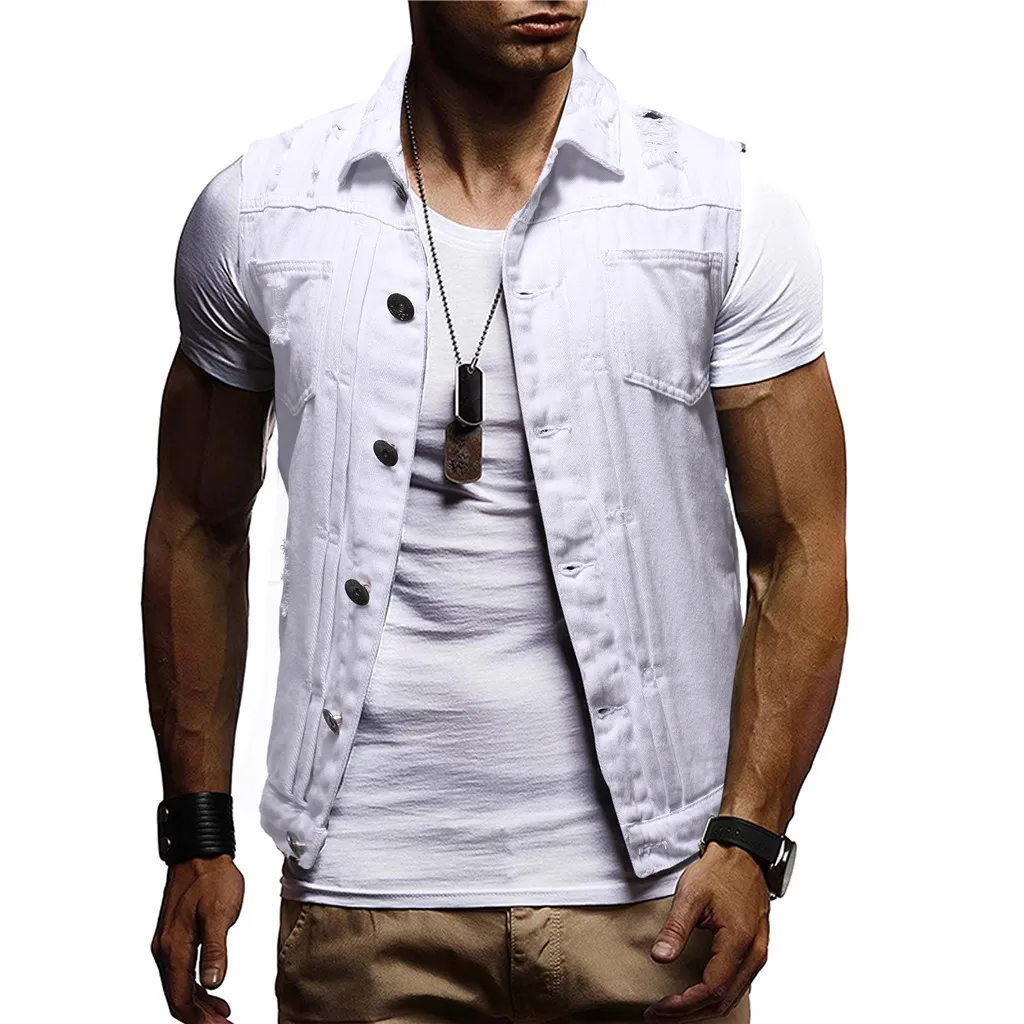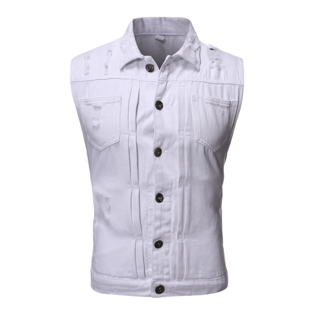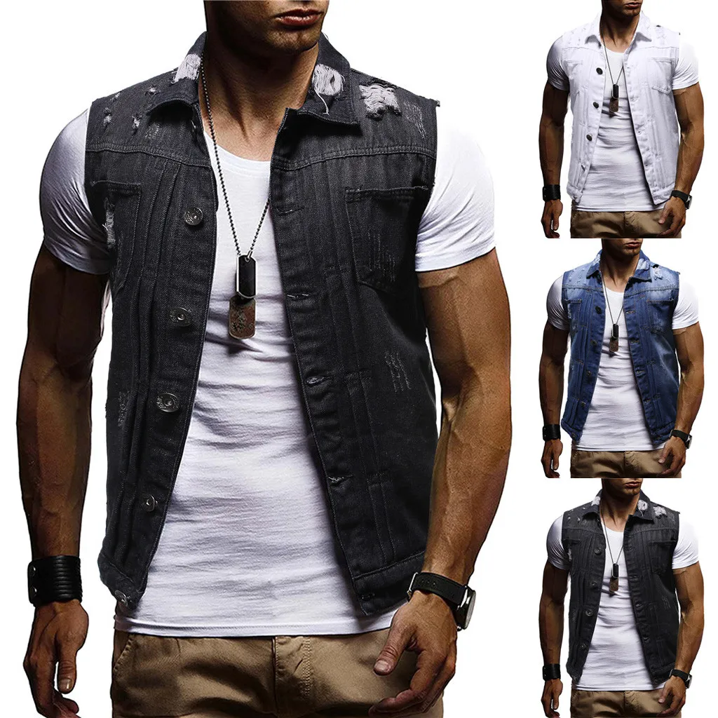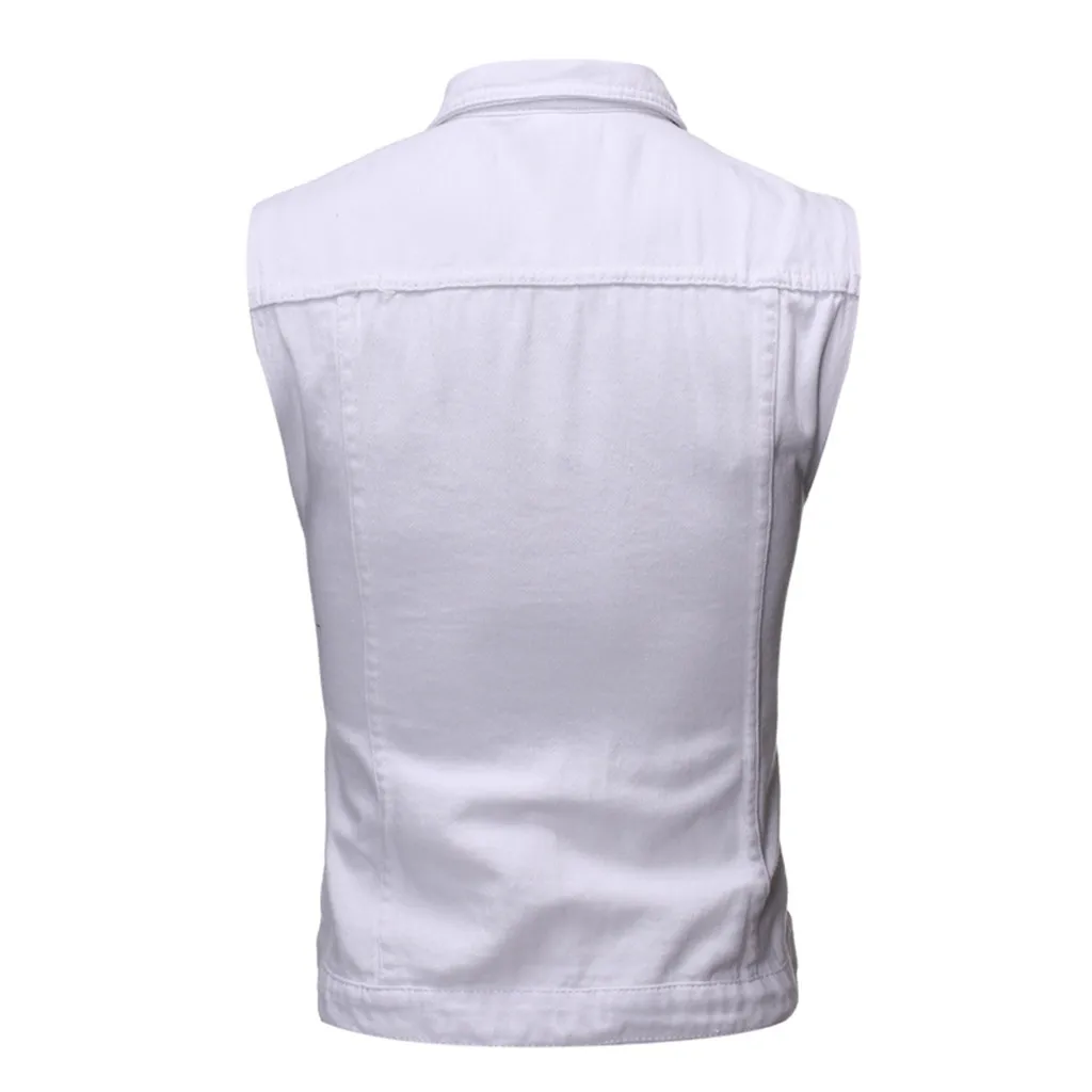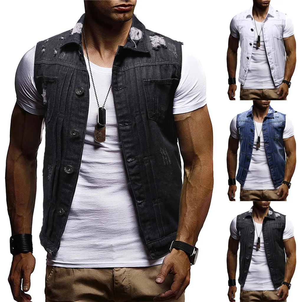 Men's Autumn Winter Destroyed Vintage Denim Jacket Waistcoat Blouse Vest Top
