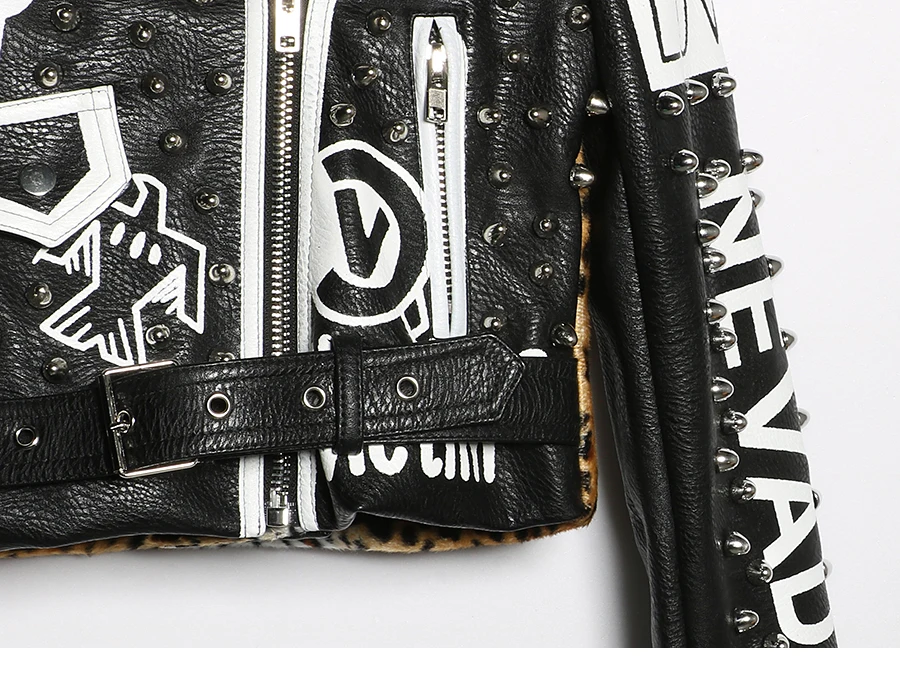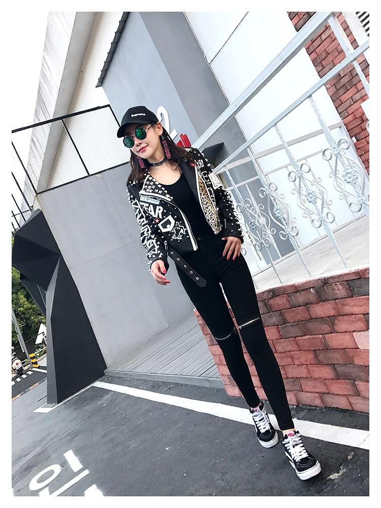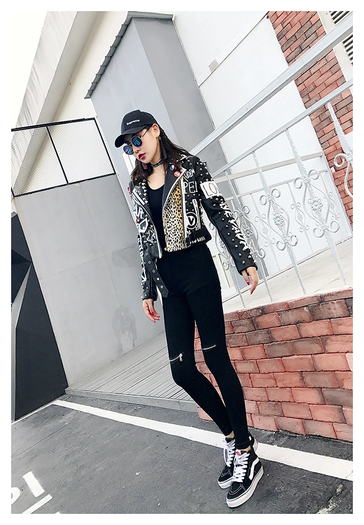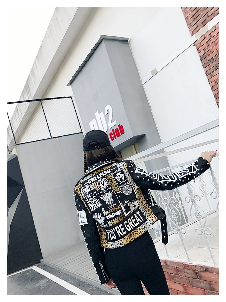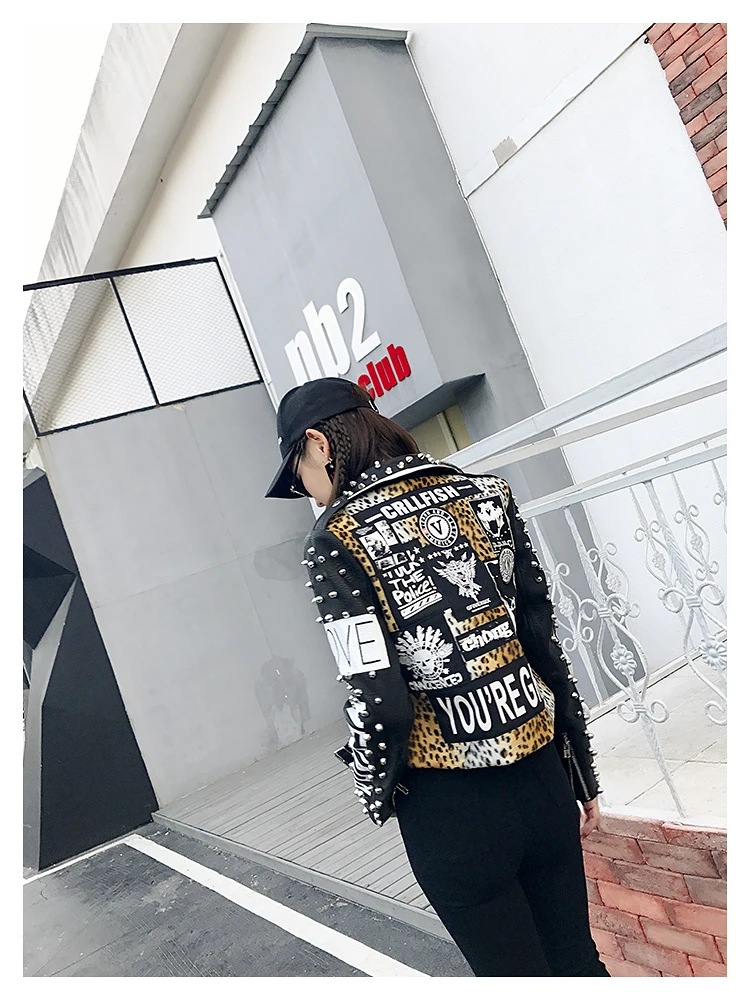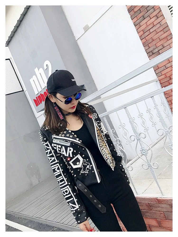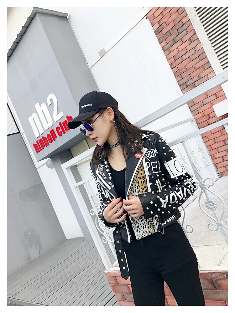 Hip Pop Rivet Pu Leather Jacket Women Punk Leopard And Letter Print Short Slim Locomotive Pu Leather Coat For Woman