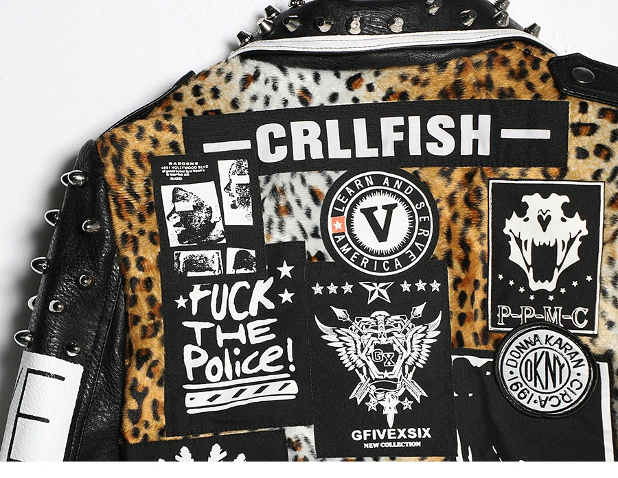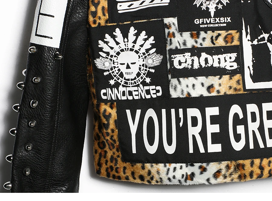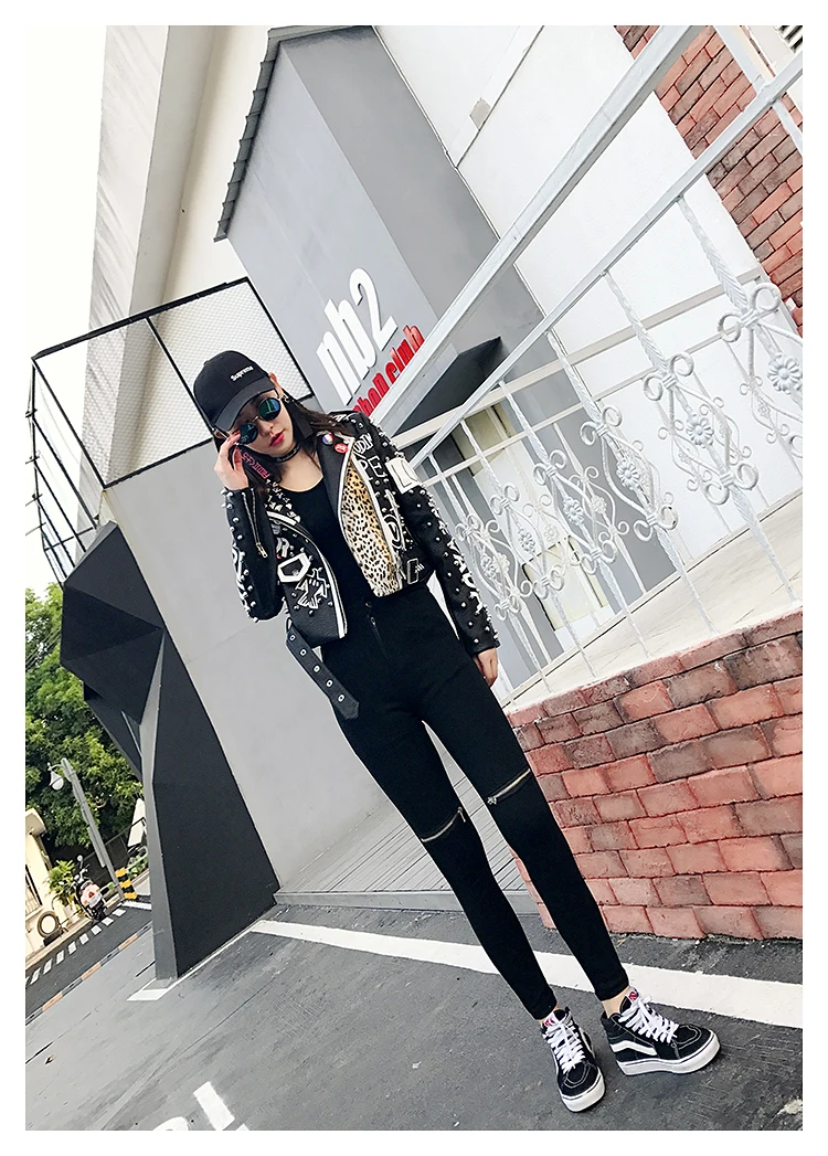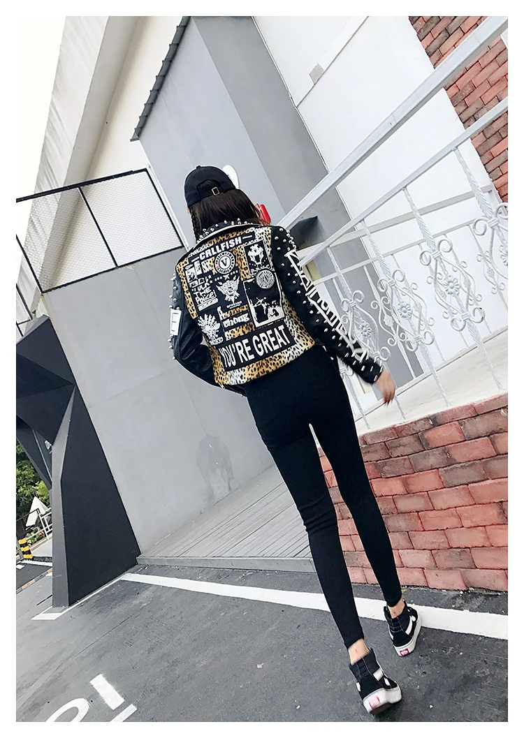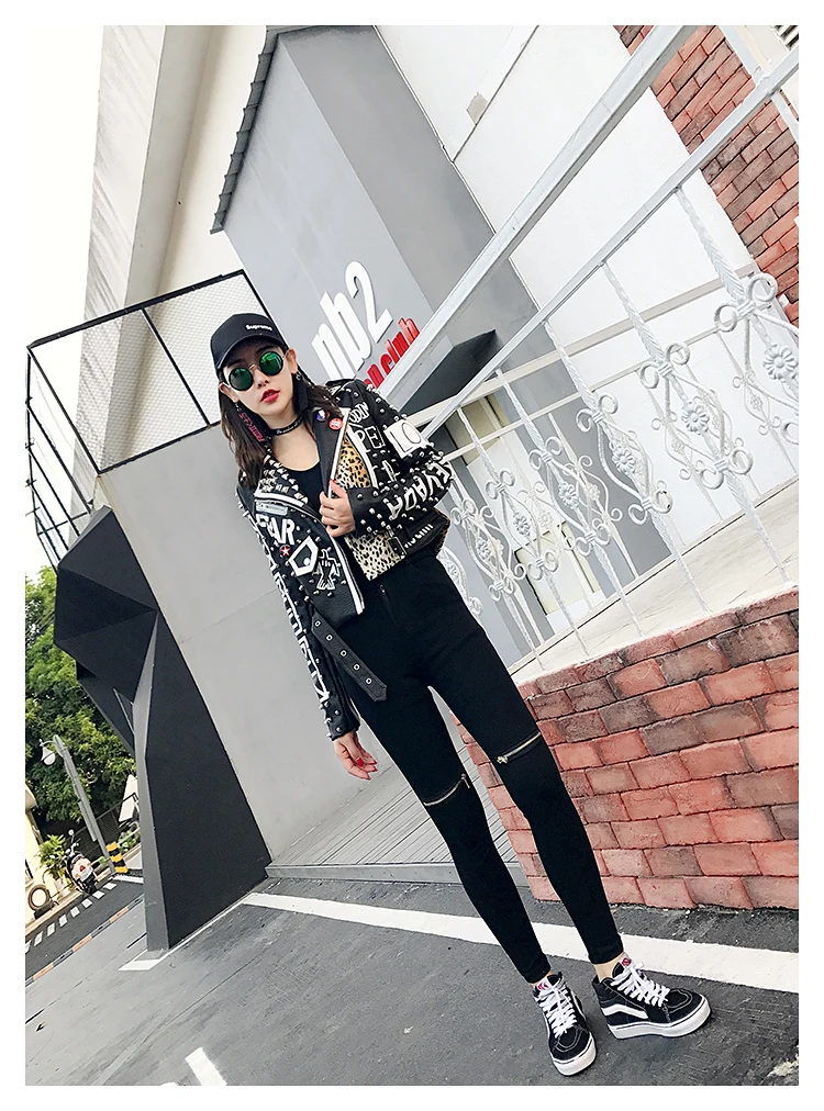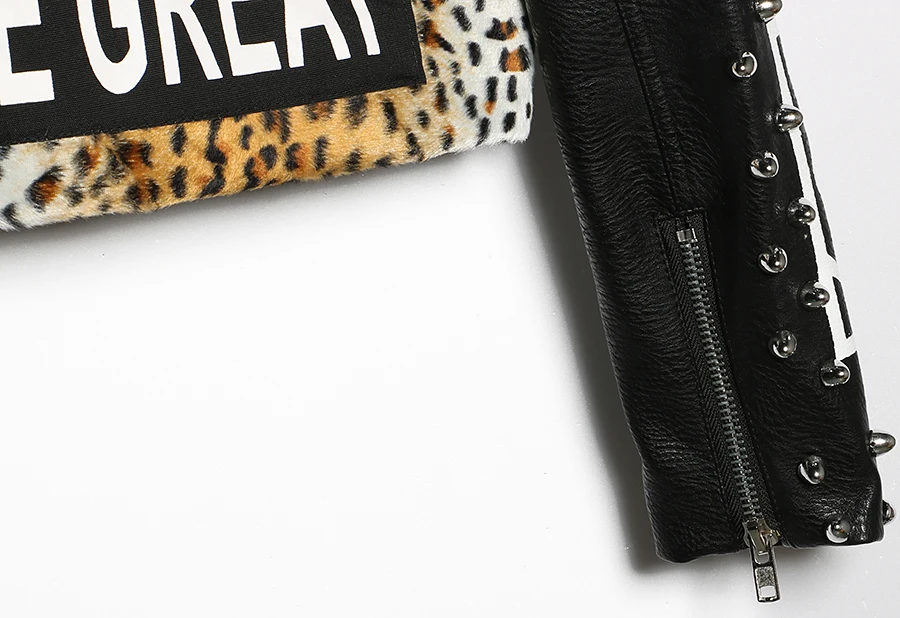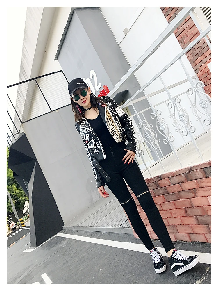 Hip Pop Rivet Pu Leather Jacket Women Punk Leopard And Letter Print Short Slim Locomotive Pu Leather Coat For Woman