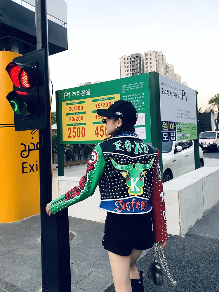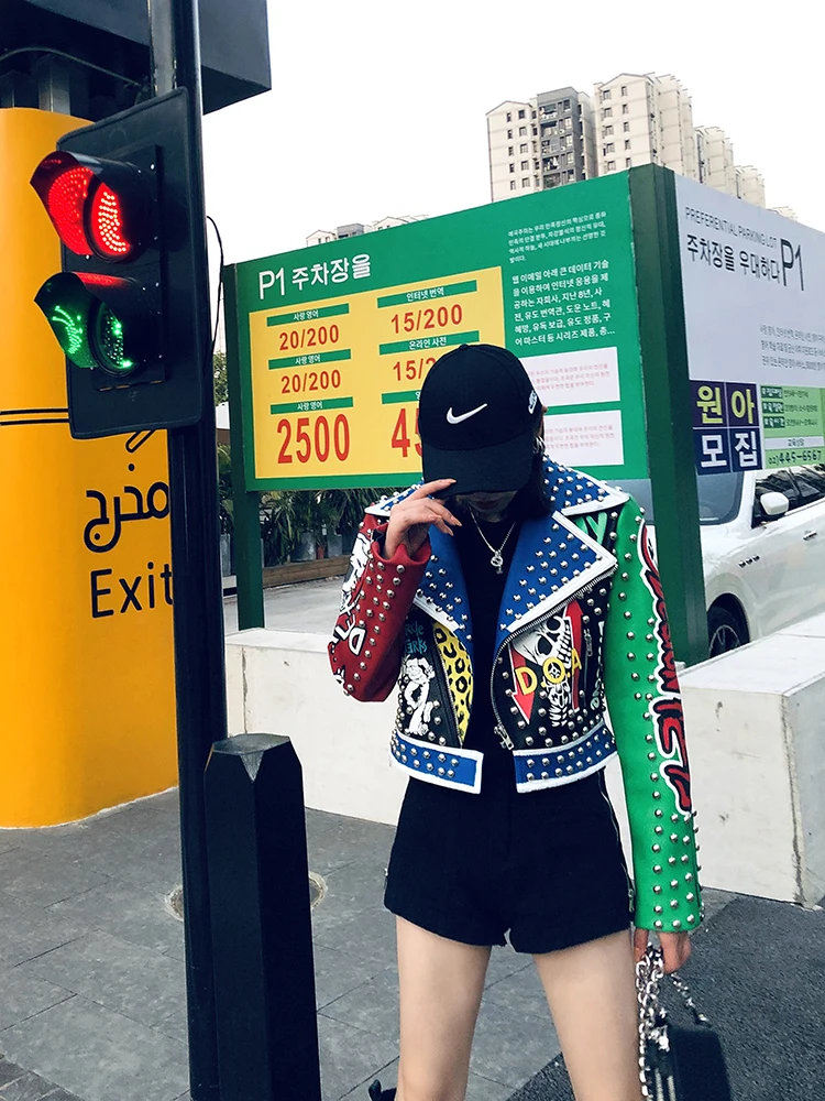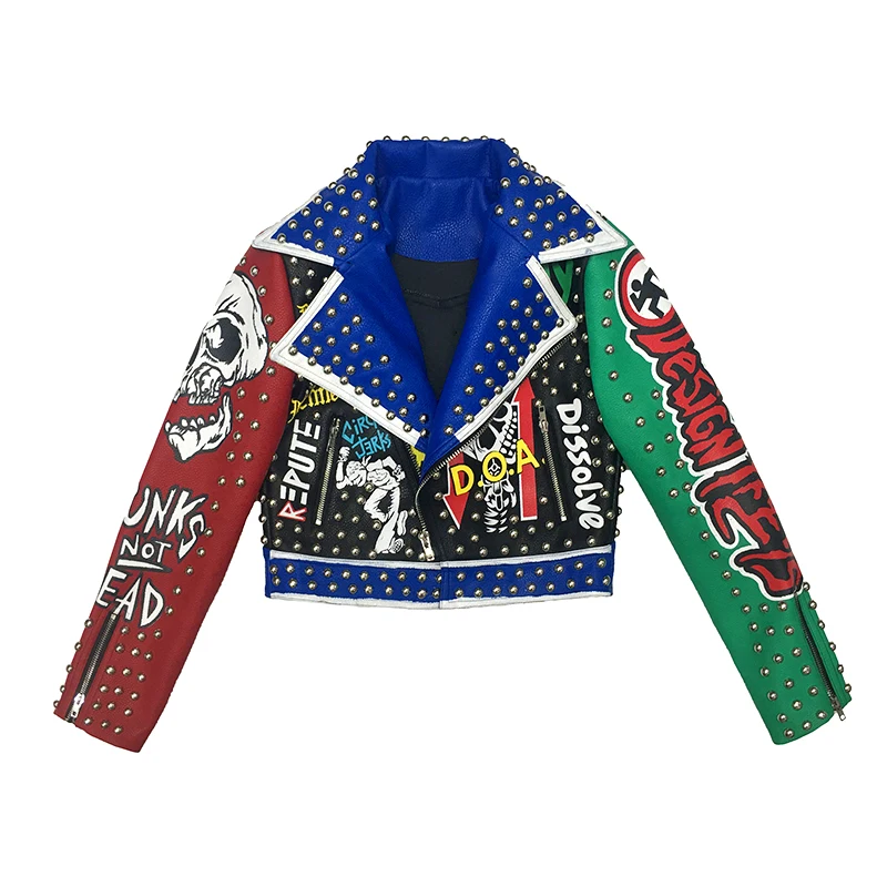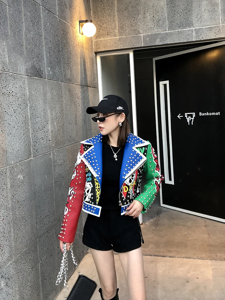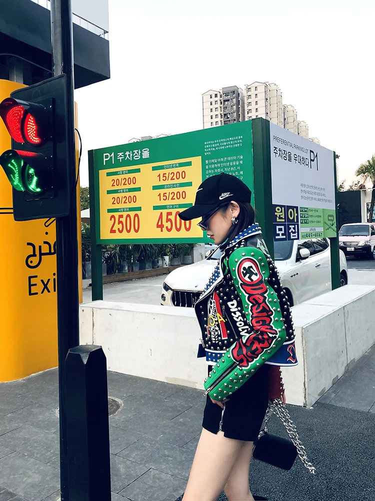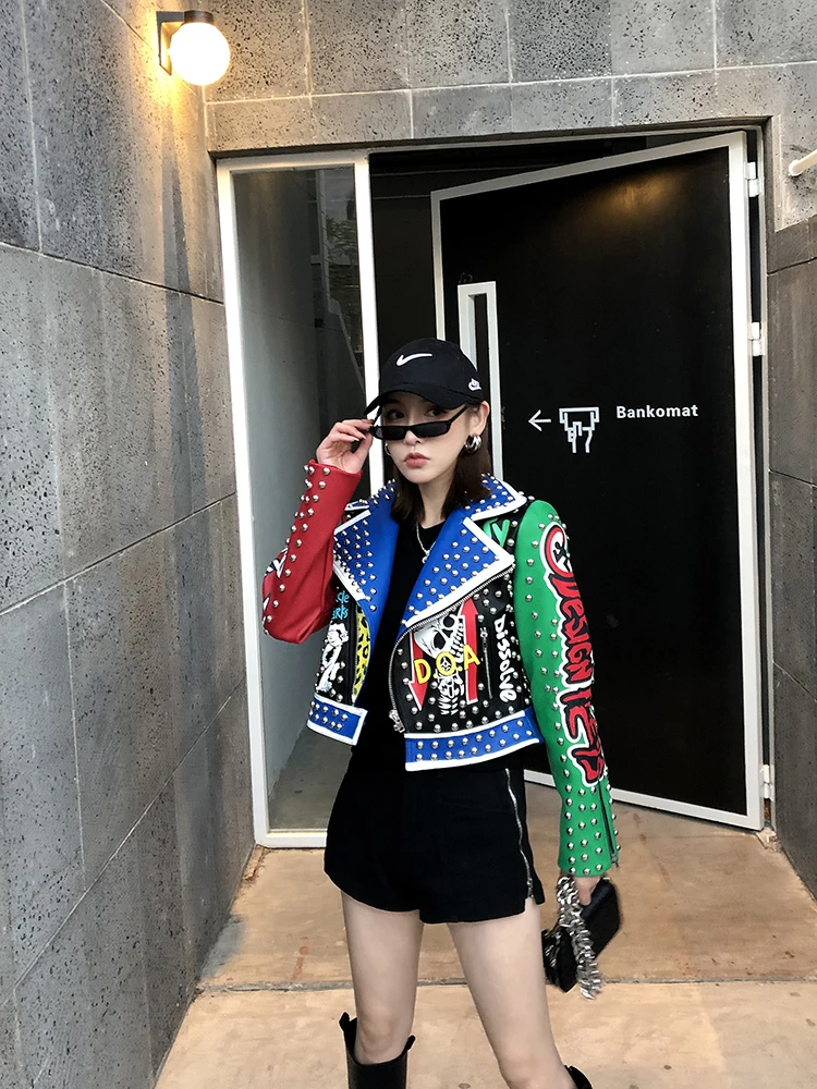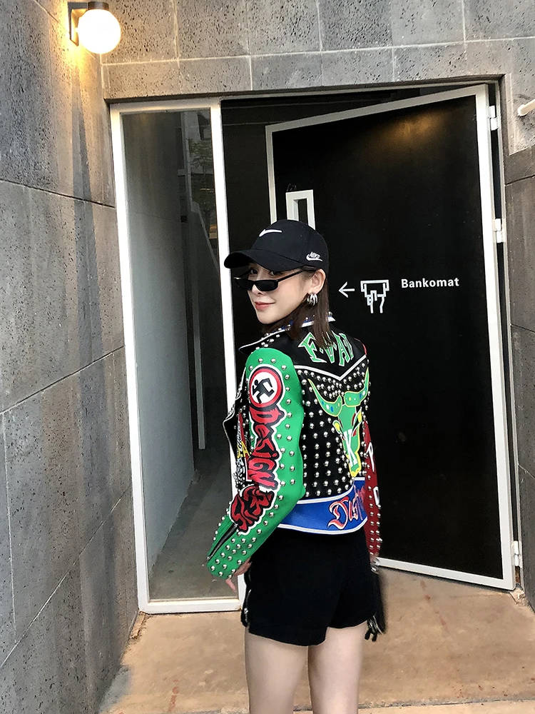 Spring Women Leather Jacket Coat Graffiti Rivets Beading Punk Cool Woman Pu Leather Coat Good Quality Women Coats Chaqueta Mujer