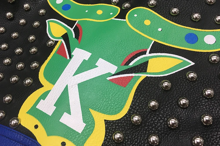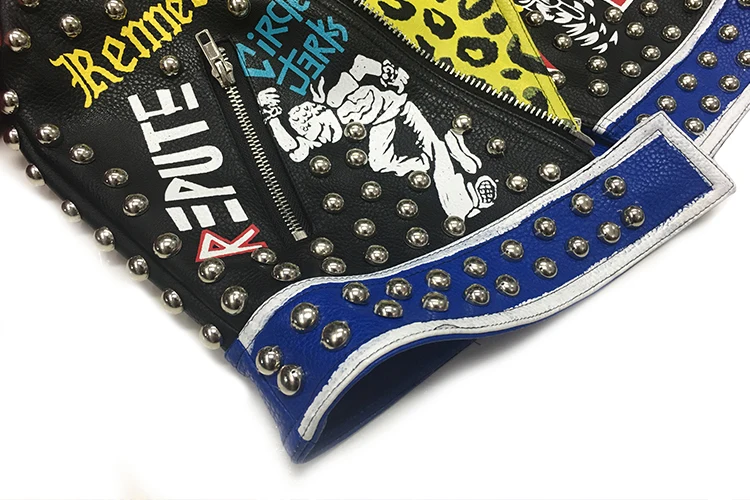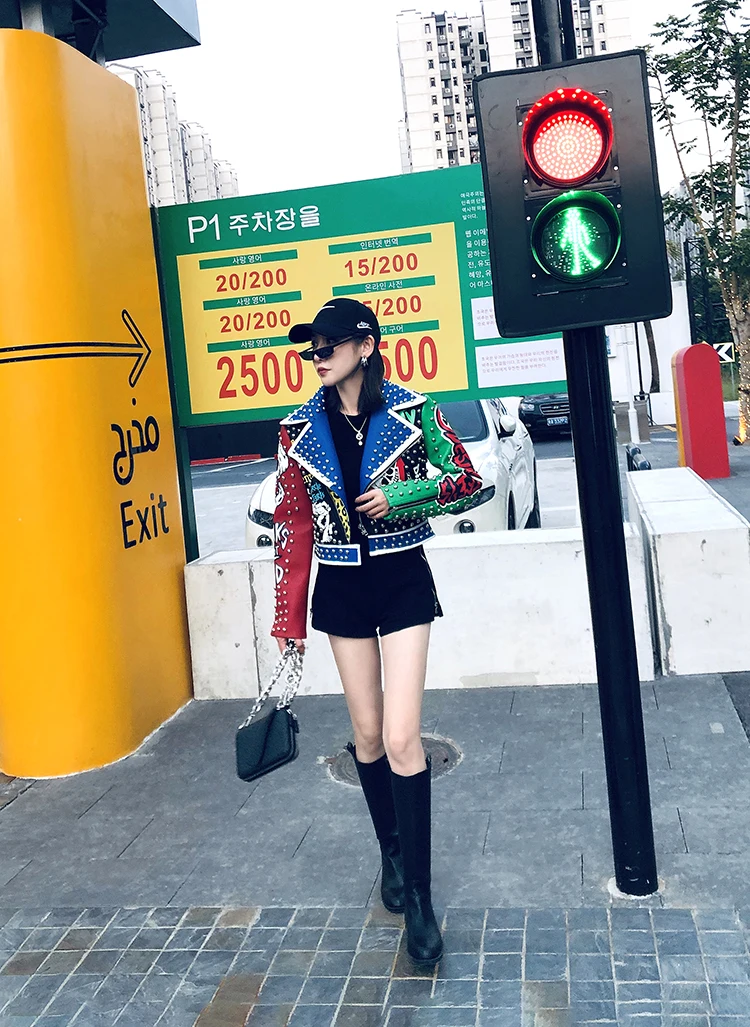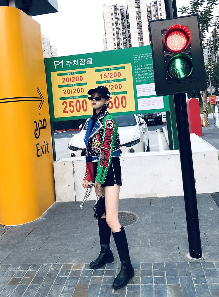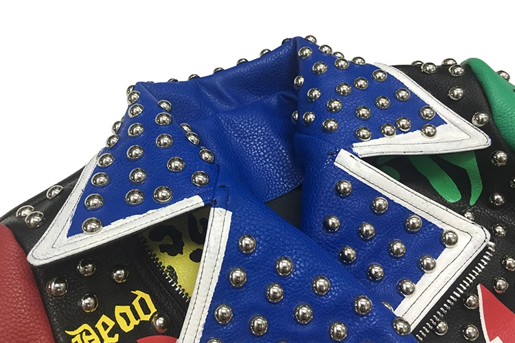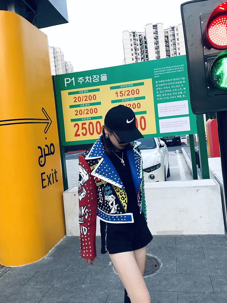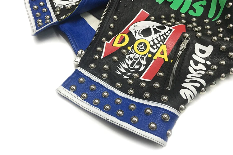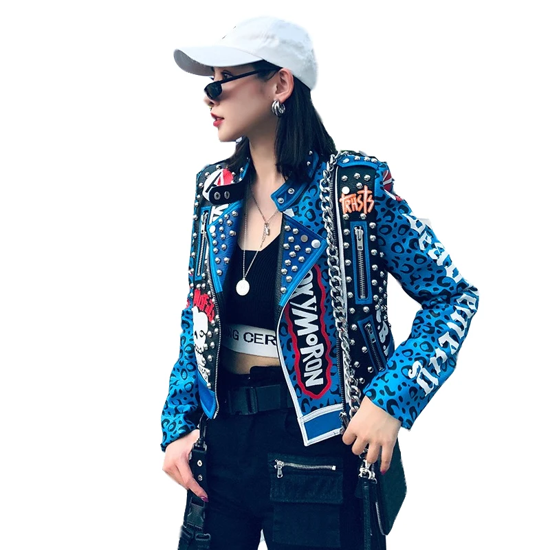 Spring Women Leather Jacket Coat Graffiti Rivets Beading Punk Cool Woman Pu Leather Coat Good Quality Women Coats Chaqueta Mujer