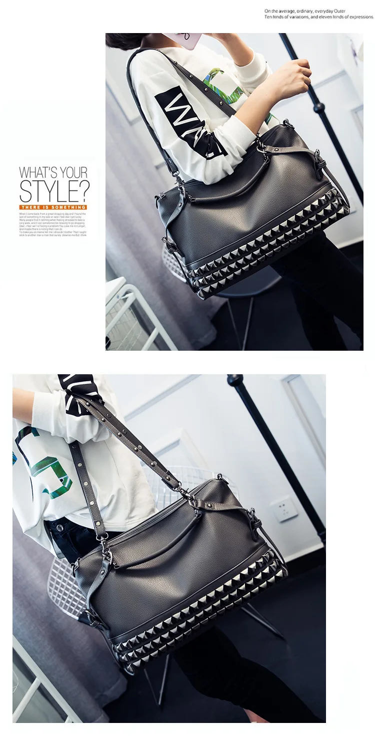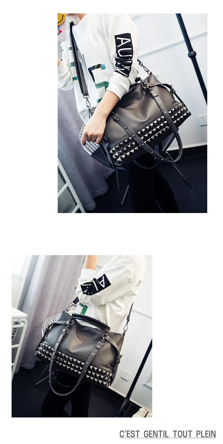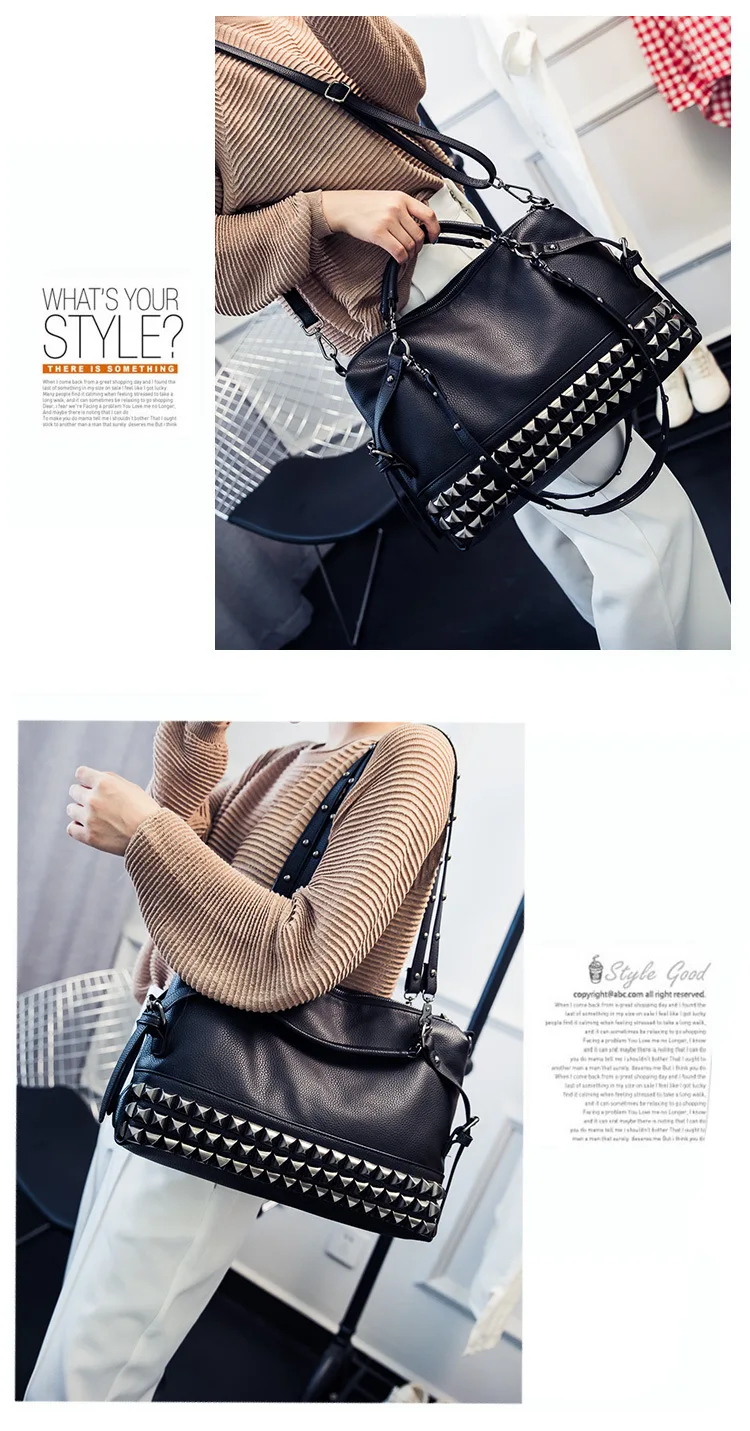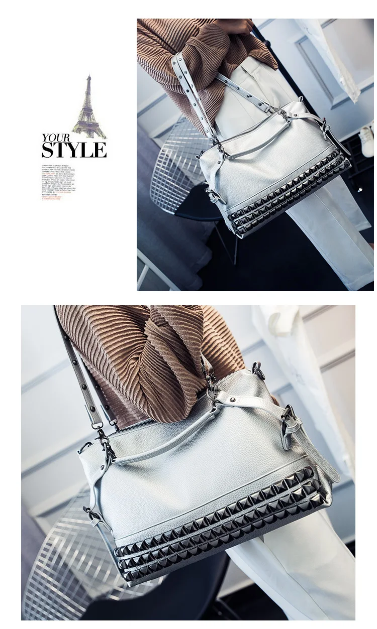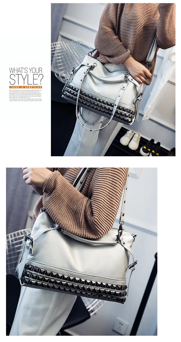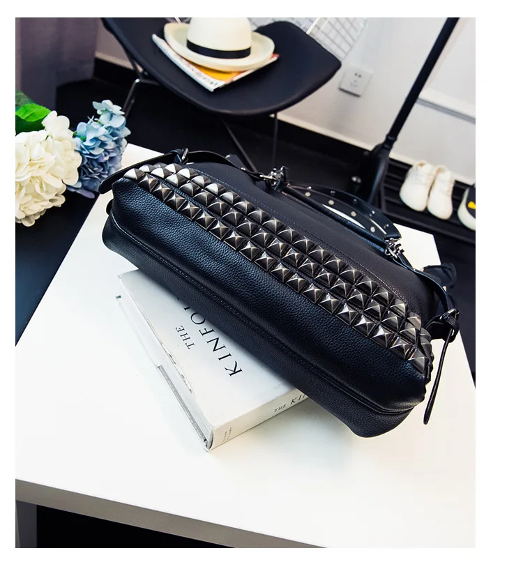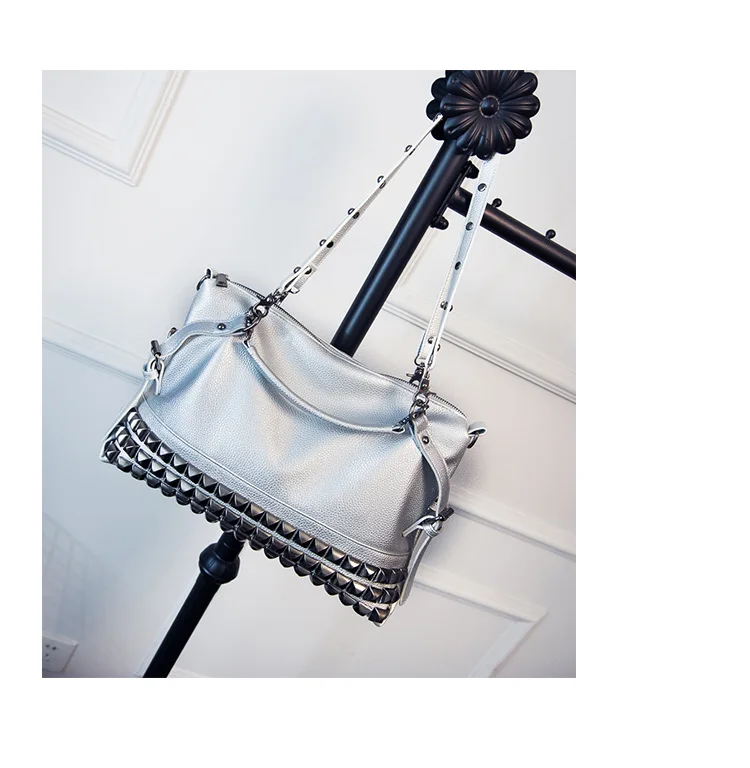 2020 new women's bag PU leather solid color lychee pattern large capacity rivet bag shoulder diagonal shoulder bag punk bag