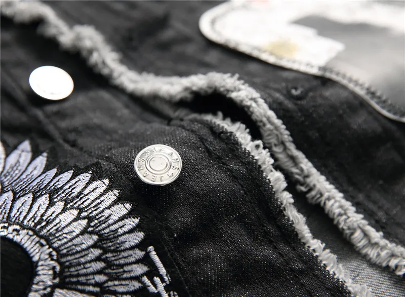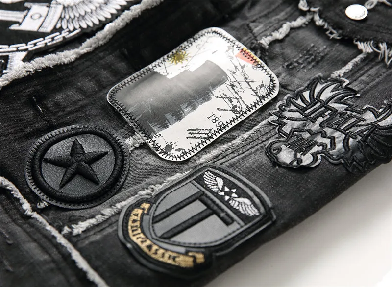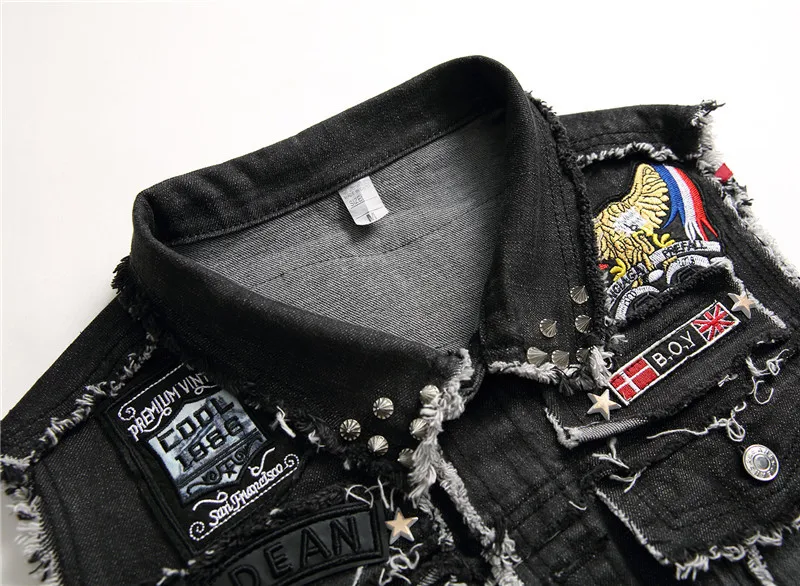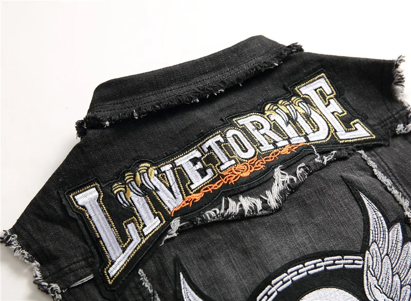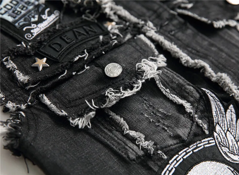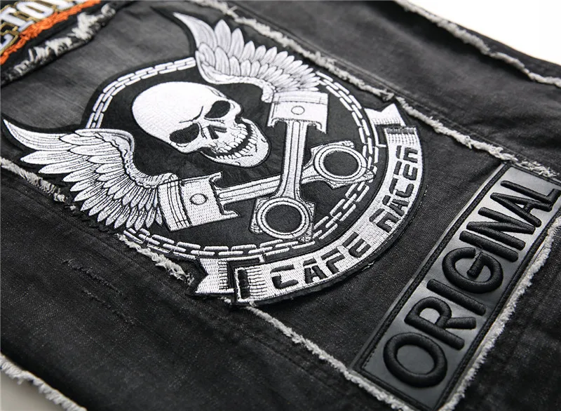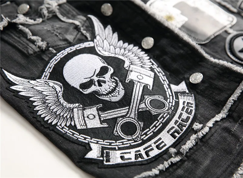 Men's skull embroidery black fringe Locomotive denim vest Trendy patches patchwork rivet letters slim waistcoat Tank top